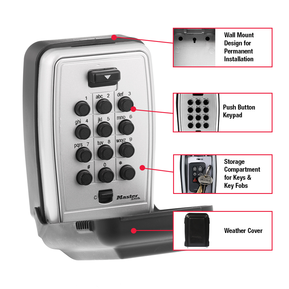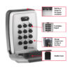 ეს საშუალო ზომის საკეტის ყუთი იდეალურია გასაღებების უსაფრთხოდ შესანახად და გაზიარებისთვის. დამზადებულია გამძლე თუთიის შენადნობისგან (zinc alloy) და აღჭურვილია პლასტმასის დამცავი საფარით, რაც იცავს მოწყობილობას ამინდისა და მტვრისგან. ყუთი კედელზე მაგრდება (მოსაკრავი სისტემით), ხოლო სამაგრი ელემენტები კომპლექტში მოყვება. იდეალურია სახლის, ოფისის ან ქირით გასაცემი უძრავი ქონების გასაღებების გასაზიარებლად. შიდა (შენახვის) ზომები: 8.5 x 6.1 x 1.2 სმ